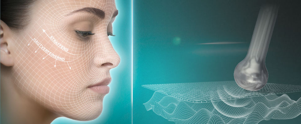 Tiefenwirksame Mikromassage Der neue Ultraschall wirkt erstmals in allen für Anti-Aging relevanten Hauttiefen. Möglich macht das eine völlig neu durchdachte Kombination der Frequenzen: 1 MHz, 3 MHz und 10 MHz – durch diesen Mix schöpfen wir die positiven biologischen Wirkungen aller Frequenzen optimal aus und aktivieren die Haut entsprechend. Der Ultraschall erhöht die Durchlässigkeit der Zellmembranen hemmt die Bindegewebe-abbauenden Enzyme und stimuliert die Fibroblastentätigkeit im Bindegewebe. Die Haut wirkt dadurch insgesamt aufgepolstert. Die mechanische, thermische und chemische Wirkung des Ultraschalles fördert den Lymphfluss und stärkt die Gefäße. Gleichzeitig werden Hautdurchblutung und Zellstoffwechsel angeregt, die Elastizität der Collagenfasern und deren Synthese werden gesteigert. Maximale Ergebnisse bei Behandlungen mit Ultra- schall erzielt man grundsätzlich immer bei Einhaltung einer kompletten Behandlungskur (ca. 10 Behandlungen innerhalb einer festgelegten Besuchsfrequenz), dabei hat sich eine Frequenz von 2-3 Behandlungen pro Woche für beste Ergebnisse bewährt. Behandlungsempfehlung der Hautspezialisten: Die Microdermabrasion gepaar mit dem neuen Ultraschall bietet ein breites individualisierbares Anwendungsspektrum für Ergebnisse, die sich sehen lassen können.